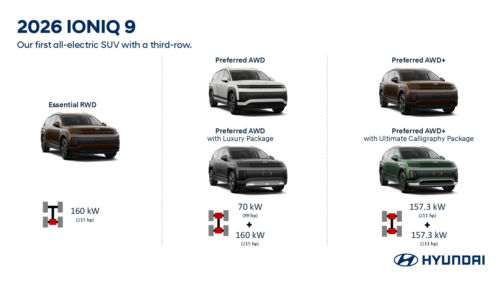 With up to 422 hp and 516 lb.-ft. of torque, the IONIQ 9 delivers exhilarating acceleration and instant power. The high torque output ensures a smooth, responsive drive, enhancing both performance and driving confidence in all conditions.